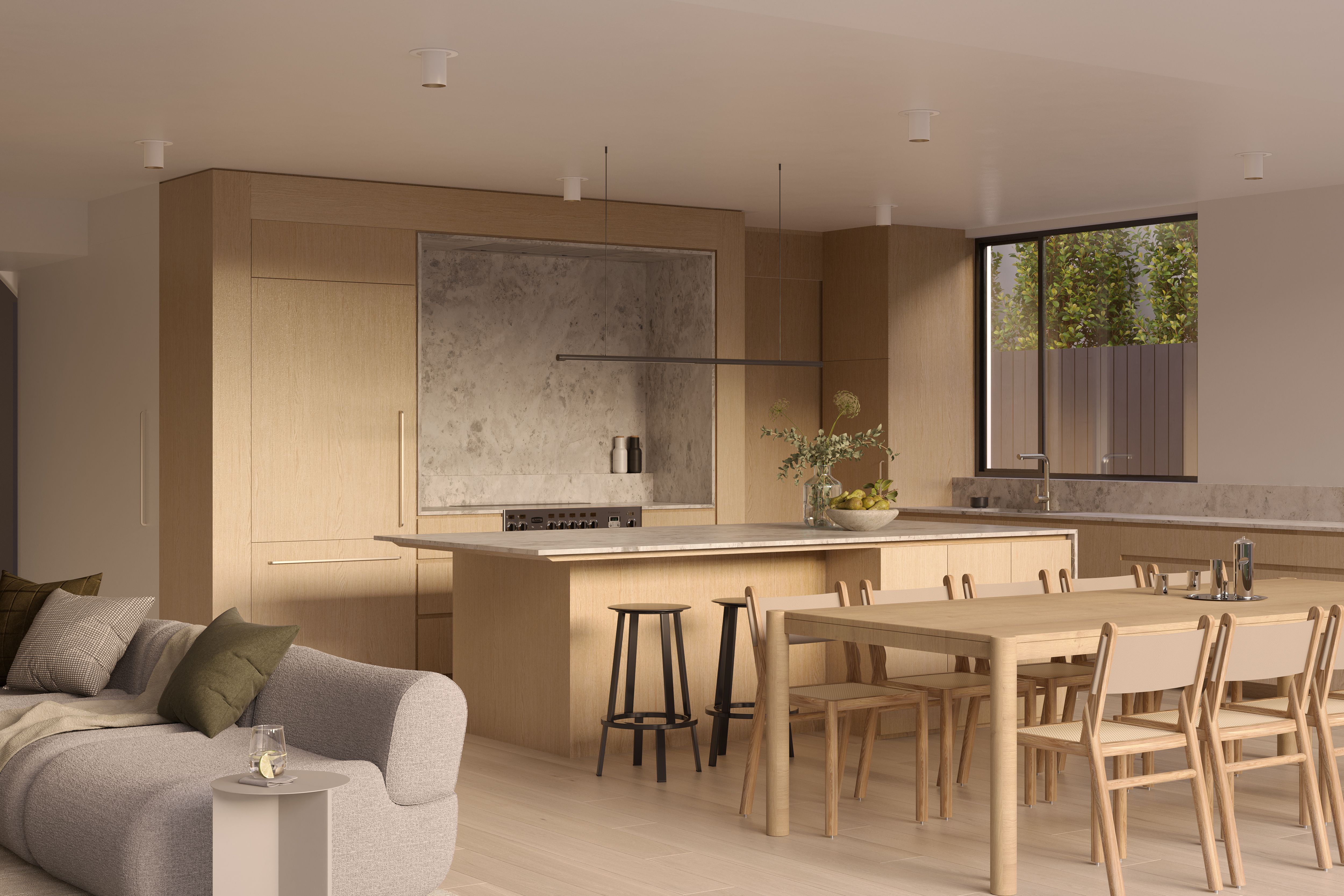 Bringing a Brazilian modernist sensibility to inner Melbourne, the Armadale Villa is designed with entertaining at its heart. Luxuriously spacious, the home is able to expand into the landscaped garden to host large-scale dinners and parties or contract into a light-filled retreat connected to landscape. Rich materiality enhances biophilic design interventions including a planted roof on the second floor for constant interactions with nature.
