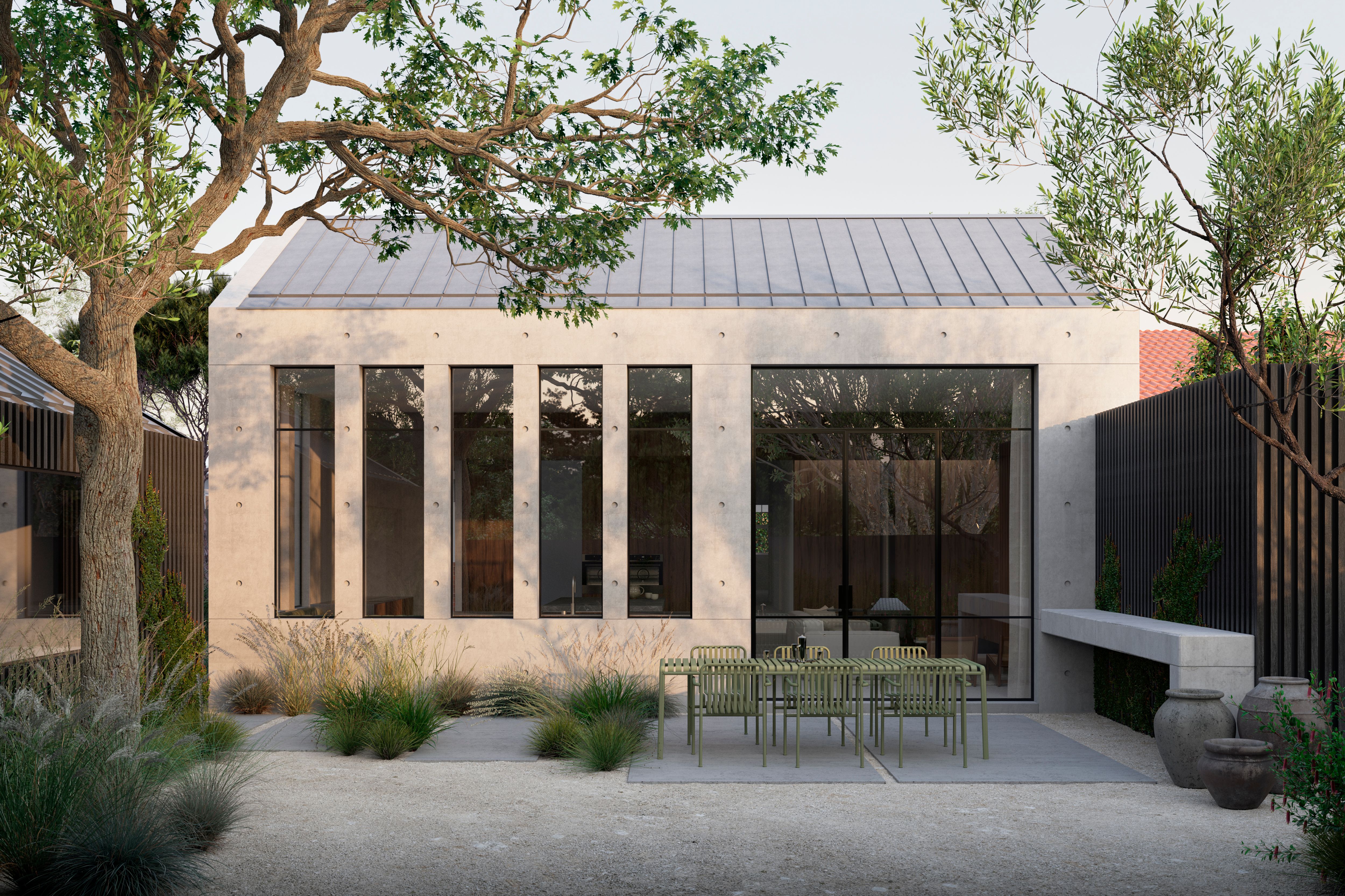 A standalone studio clad in zincalume custom orb sheeting at the back of the property is designed for multigenerational living, with walnut slatted shutters offering necessary privacy.