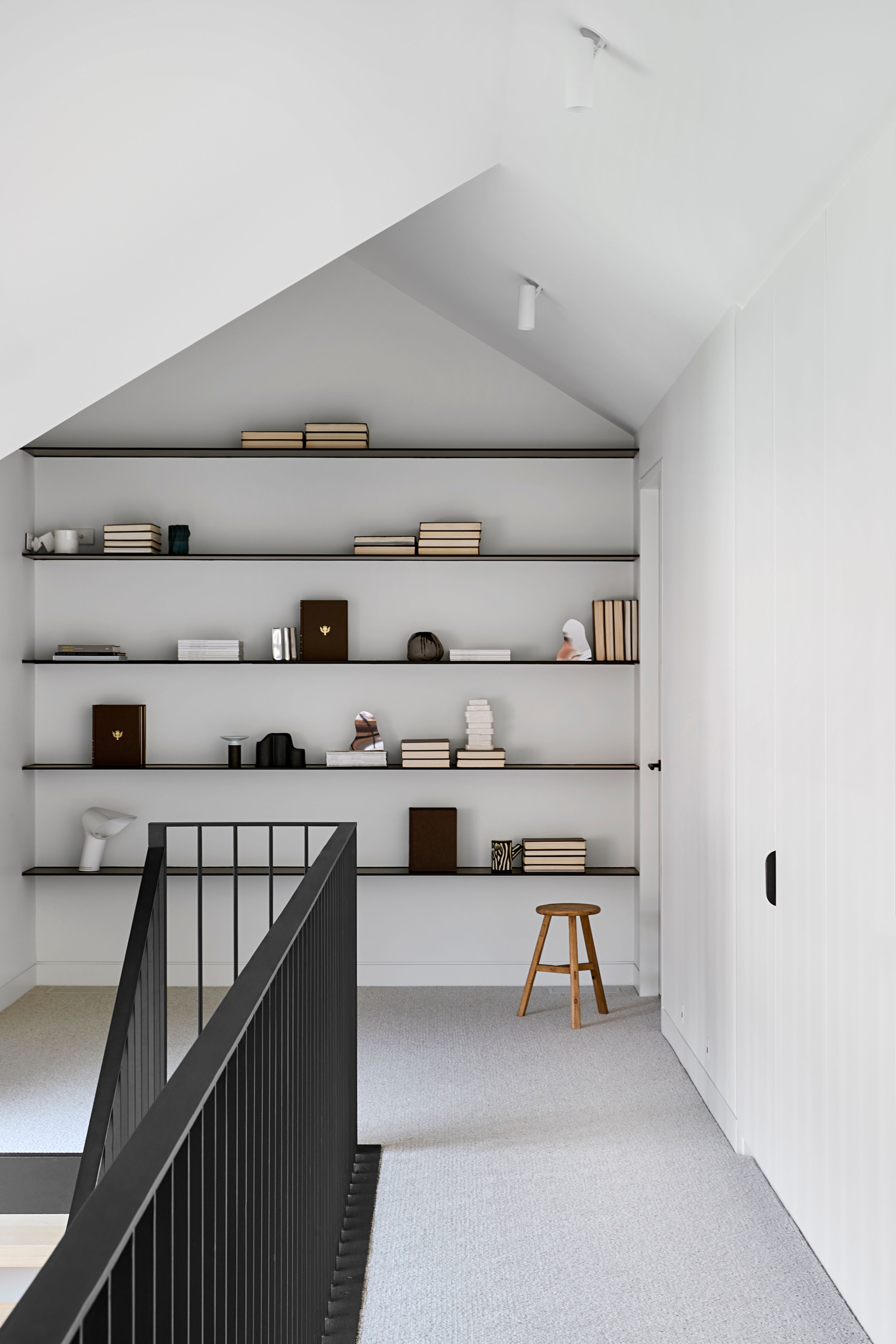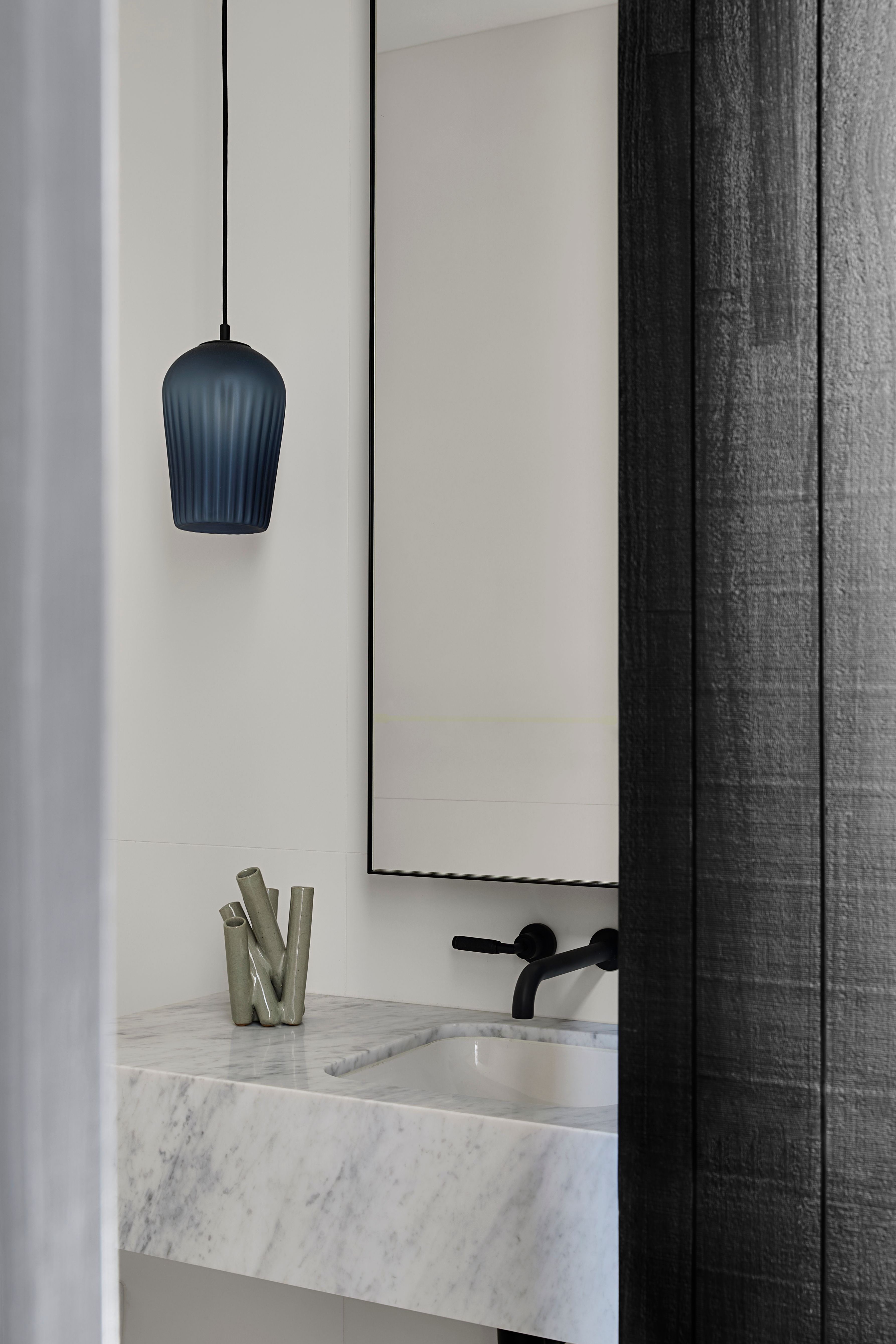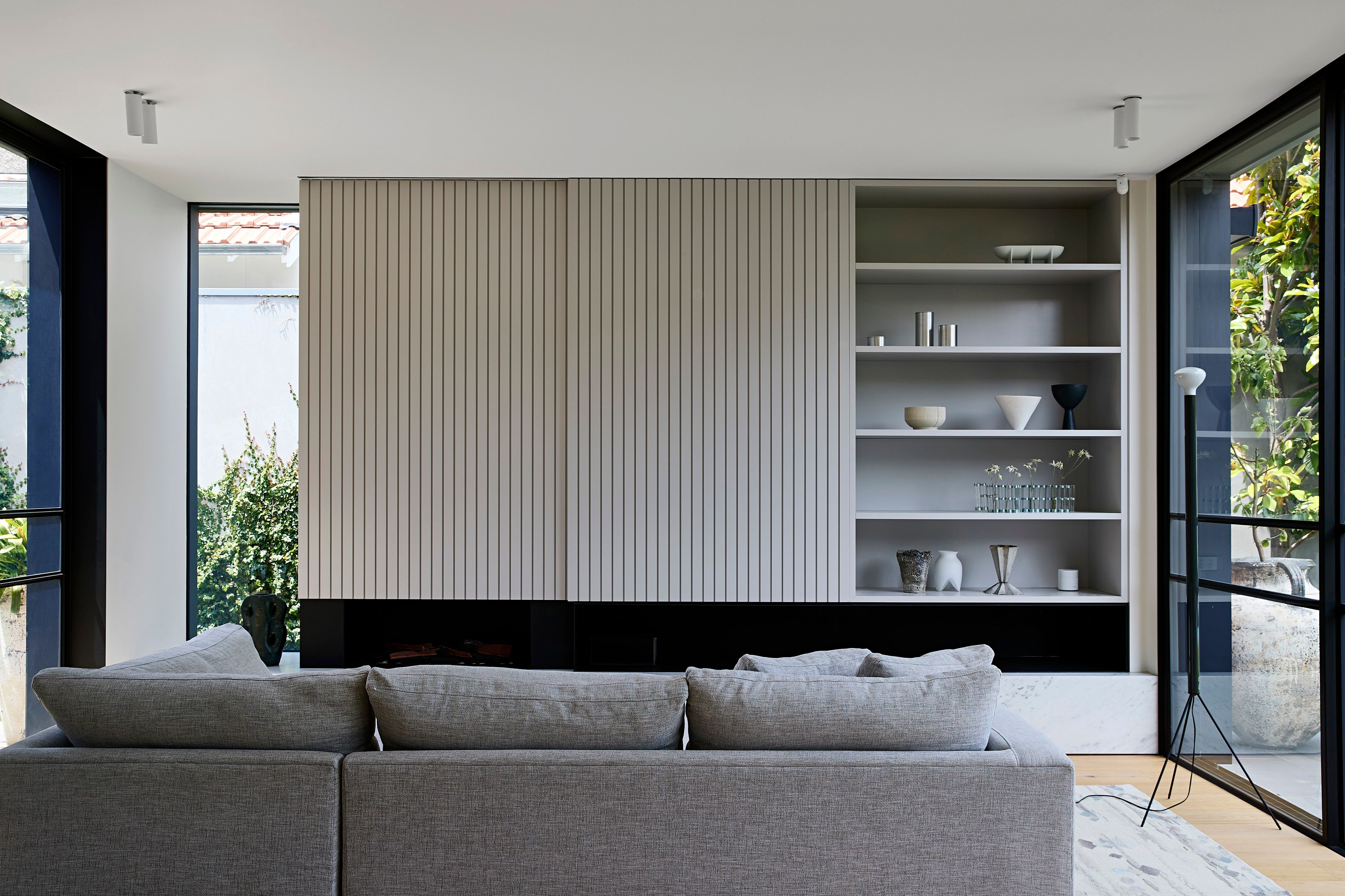 Internally, a refined palette of white walls, grey cabinetry, marble and terrazzo surfaces are accented with black elements, reinforcing the architectural language throughout.