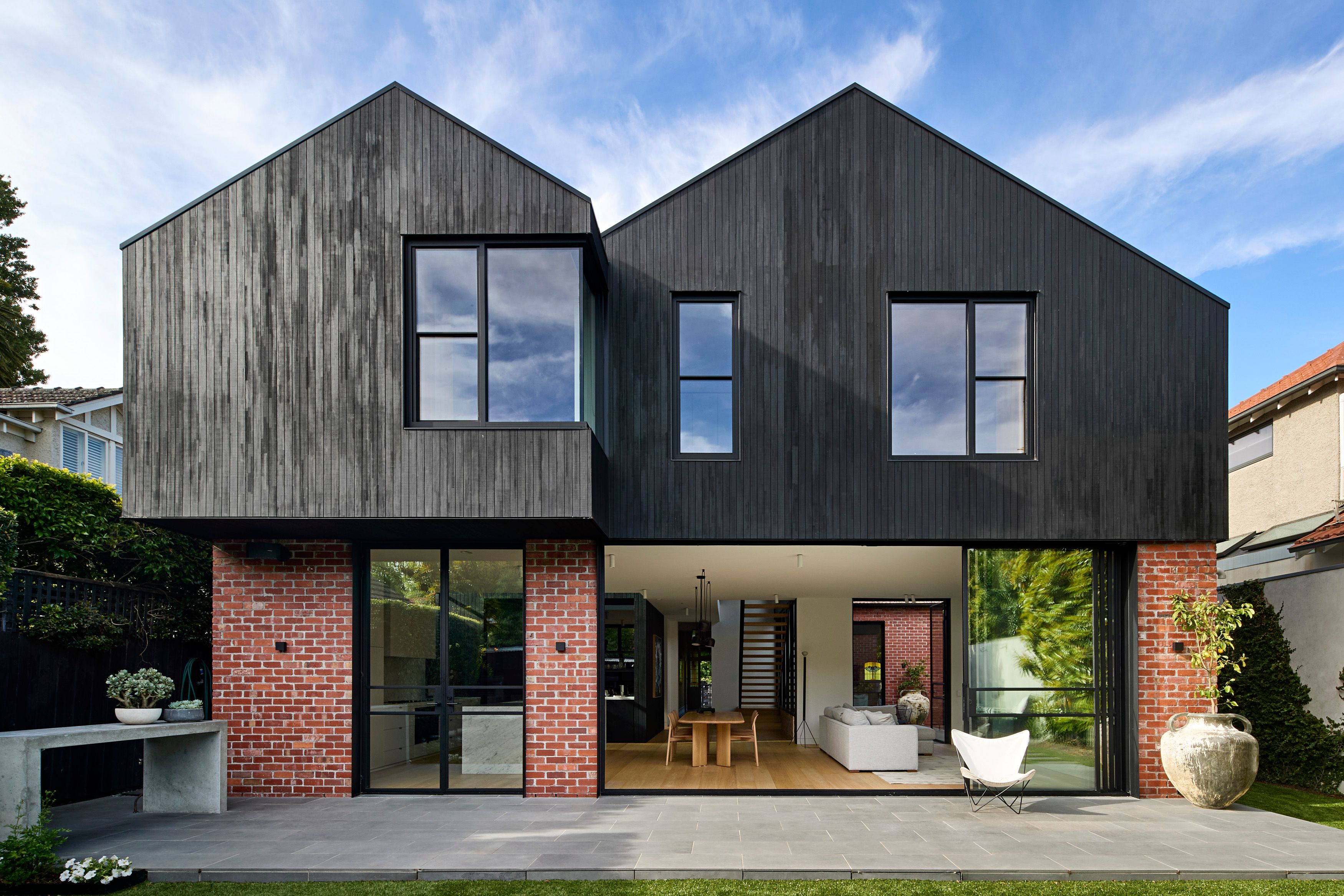 Material selection honours the original home's character: recycled red brick walls punctuated by black steel shrouds and steel-framed windows. The upper volumes feature black stained thermally modified timber cladding, creating clean angular shapes that echo the original roof pitch.
