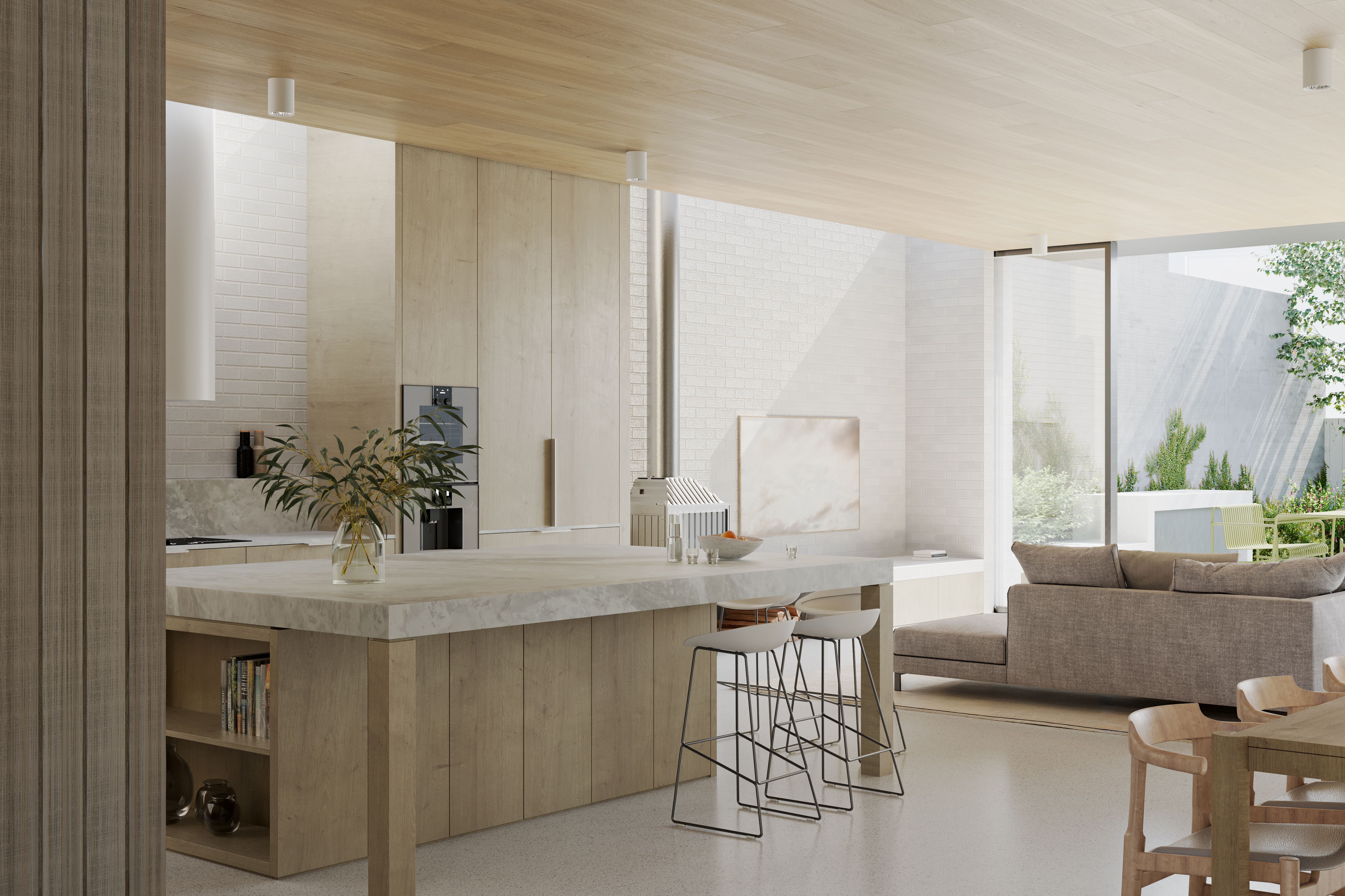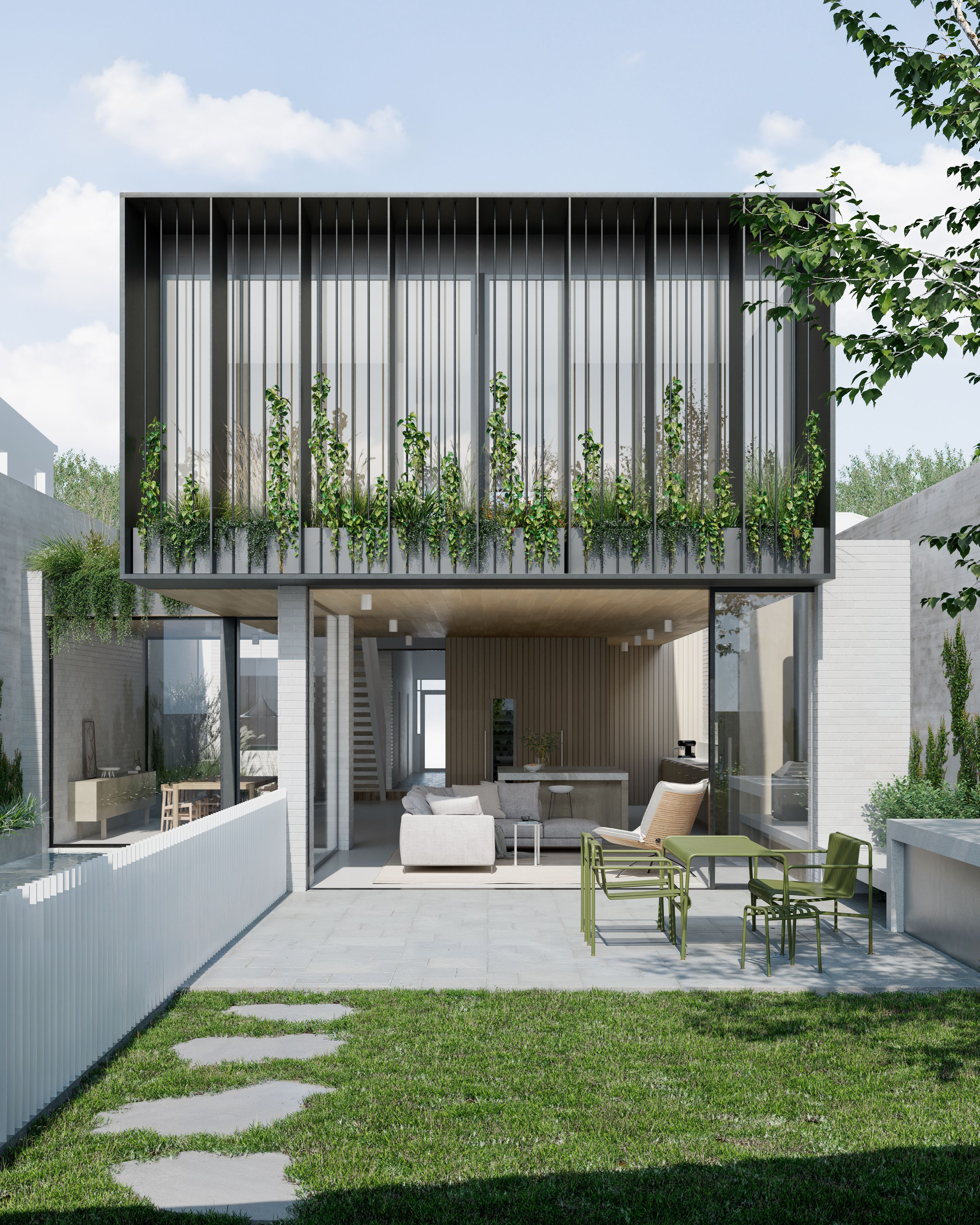 The Floating Frame House seemingly hovers above the landscaped garden and lap pool; an emphatically contemporary and spacious addition to an inner-city home. The extension embraces light-filled open-plan living downstairs while the upper level’s custom steel-bladed façade is ensconced in greenery, marking the changing seasons with subtle shifts in light and shade.