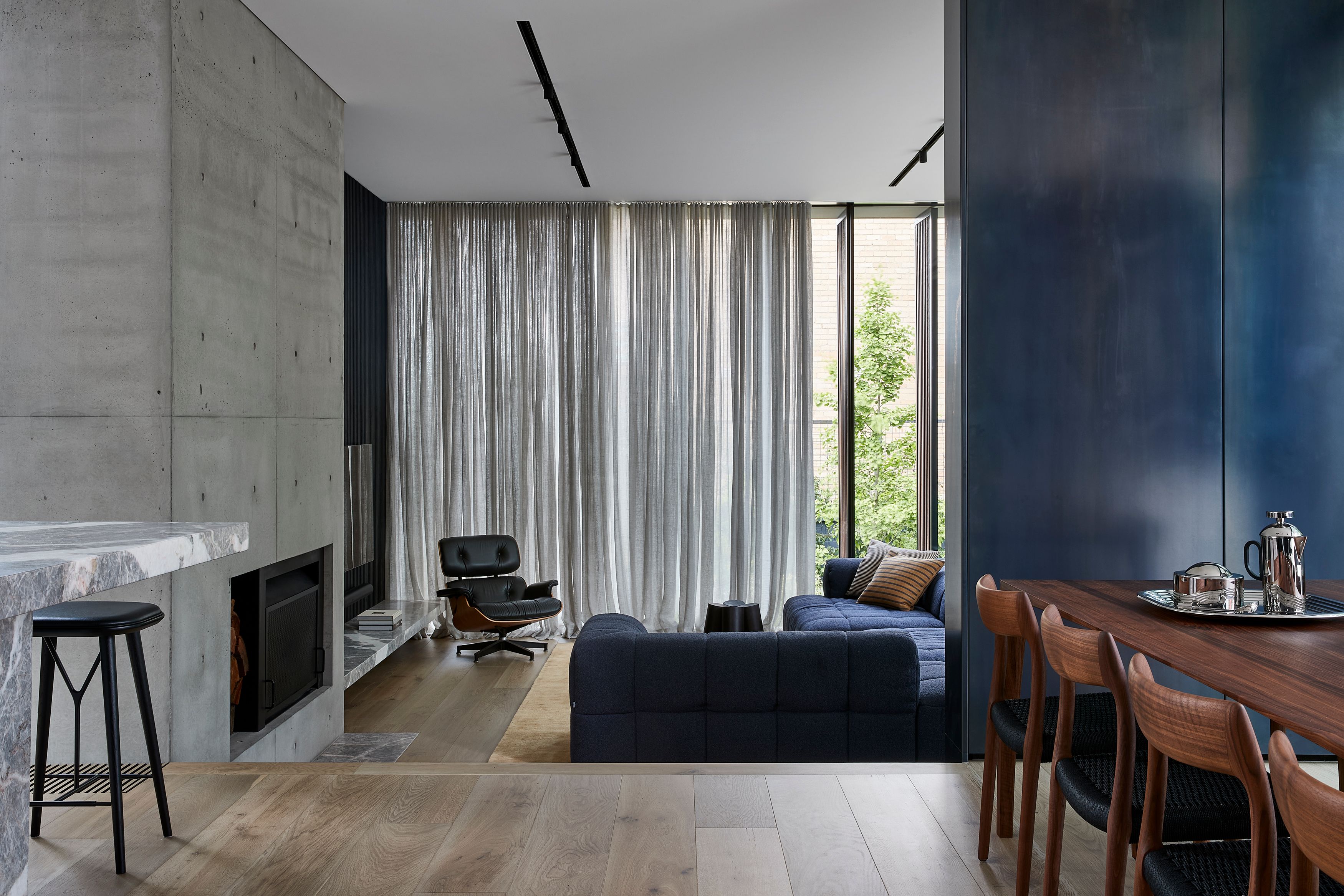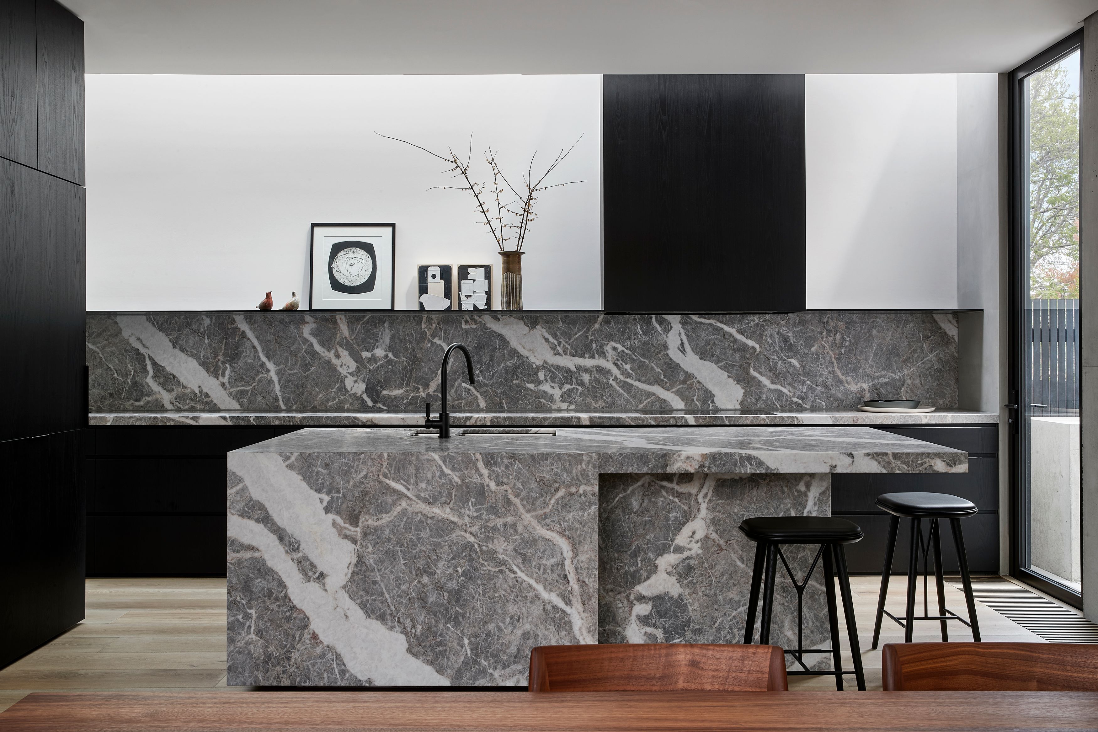 Striking a balance between the durability required by a young family and a bold aesthetic statement, the interior palette embraces the authenticity of natural materials. Highly veined marble, sleek black timber veneer and robust black steel harmonise with the timber screens for a resilient, timeless appeal.